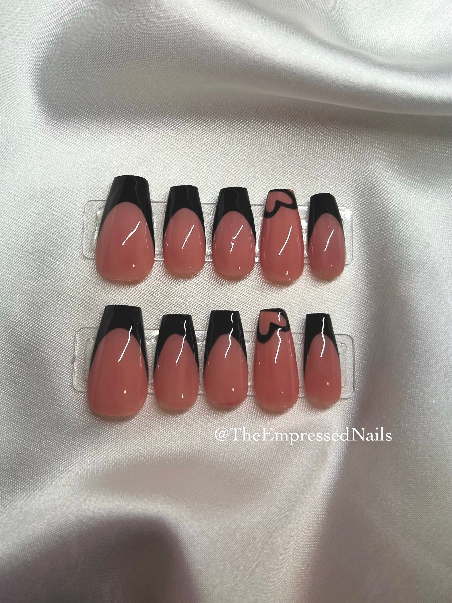 Elevate your nail game with TheEmpressedNails handmade Black French Tip and Heart. These coffin press-on nails feature a classic black French tip design with a delicate heart accent, adding a touch of elegance to any look. Easy to apply and long-lasting, achieve a flawless manicure in minutes. Perfect for any occasion.
