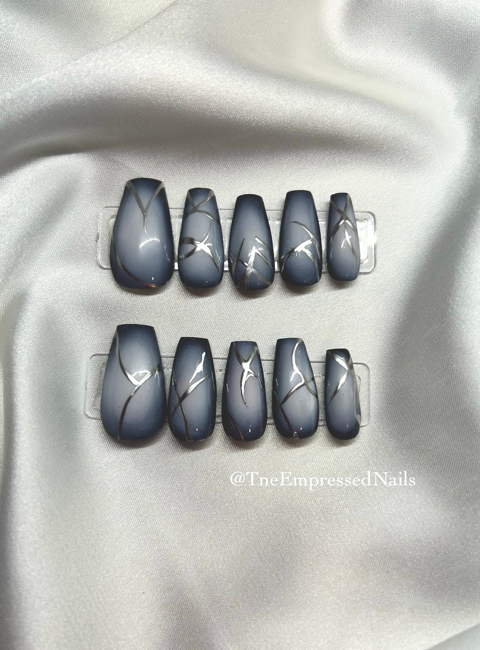 Enhance your nail game with TheEmpressedNails "Future" Press-ons. These handmade airbrushed press-ons feature a sleek design in black, white, and silver metallic chrome. Achieve a unique, futuristic look with ease and without damaging your natural nails. Elevate your style with a different side of TheEmpressedNails "Future" Press-ons.