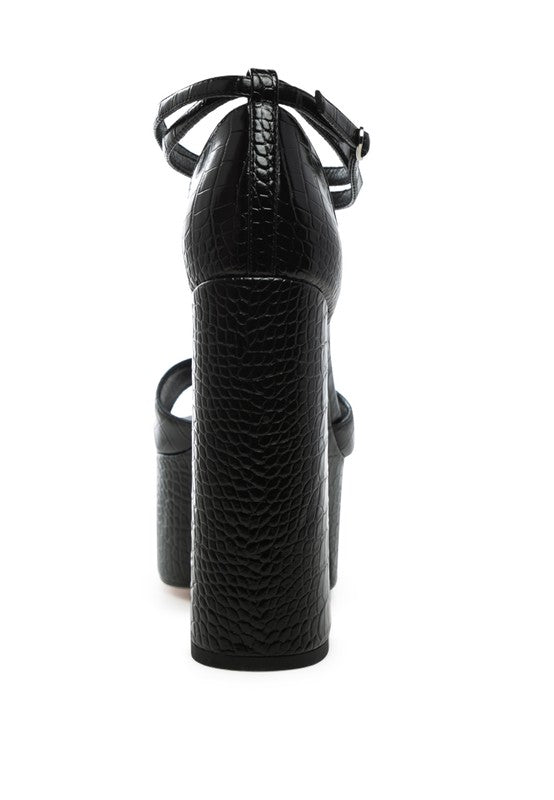 High Heeled Block Sandals with Croc Texture in solid black the sandal has ankle pin buckle fastening along with thin double straps to secure feet well. Be Social media ready with these in your wardrobe.
