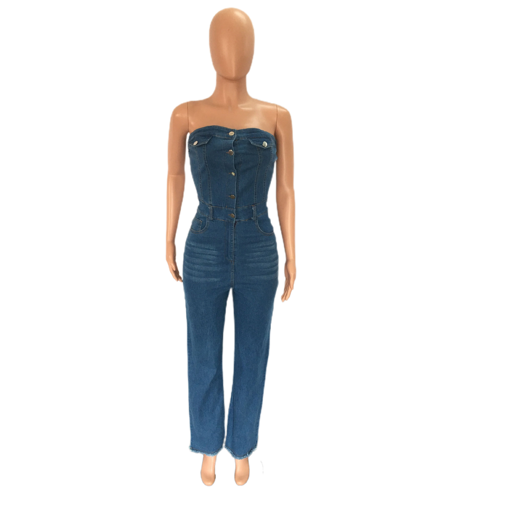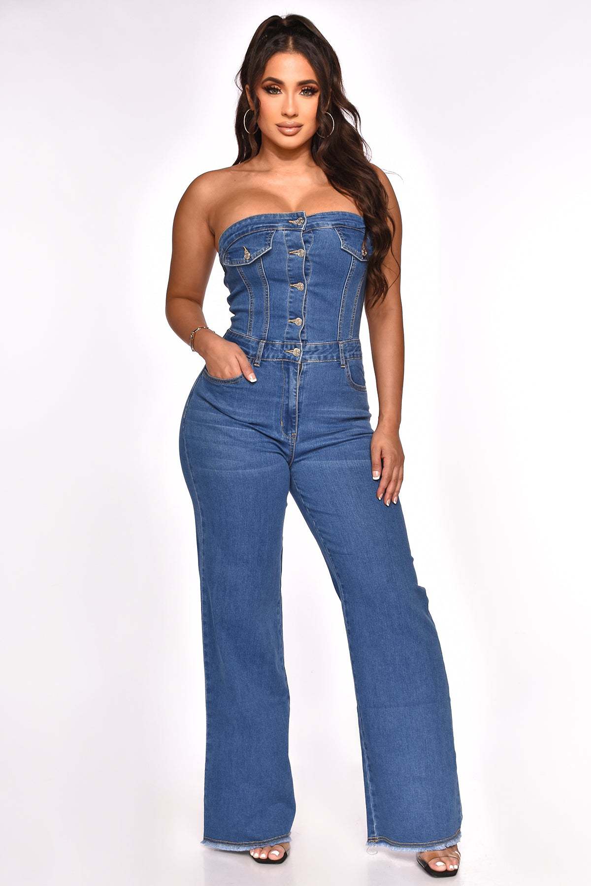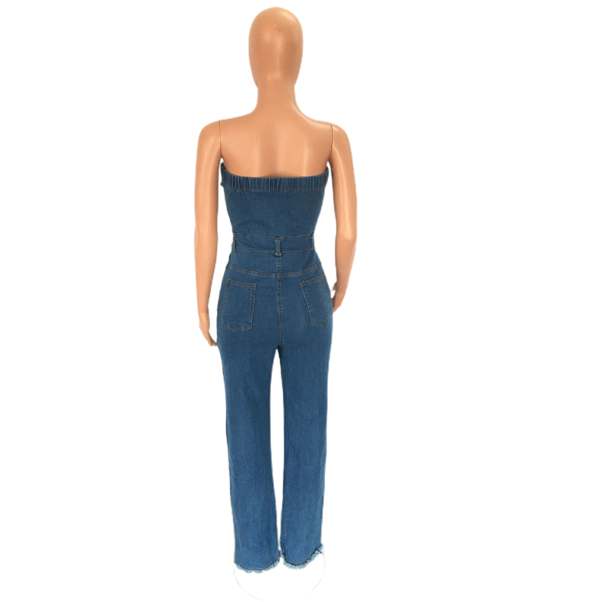 Women Clothing Tube Top Off Shoulder Slim Fit Slimming Slightly Flared Jumpsuit Jeans Blue by Joliss | Fleurcouture