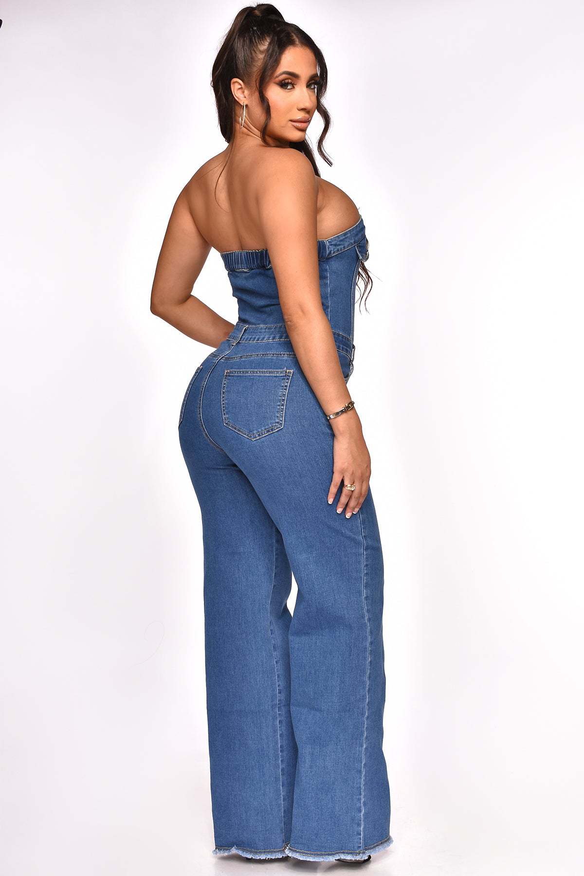 Women Clothing Tube Top Off Shoulder Slim Fit Slimming Slightly Flared Jumpsuit Jeans