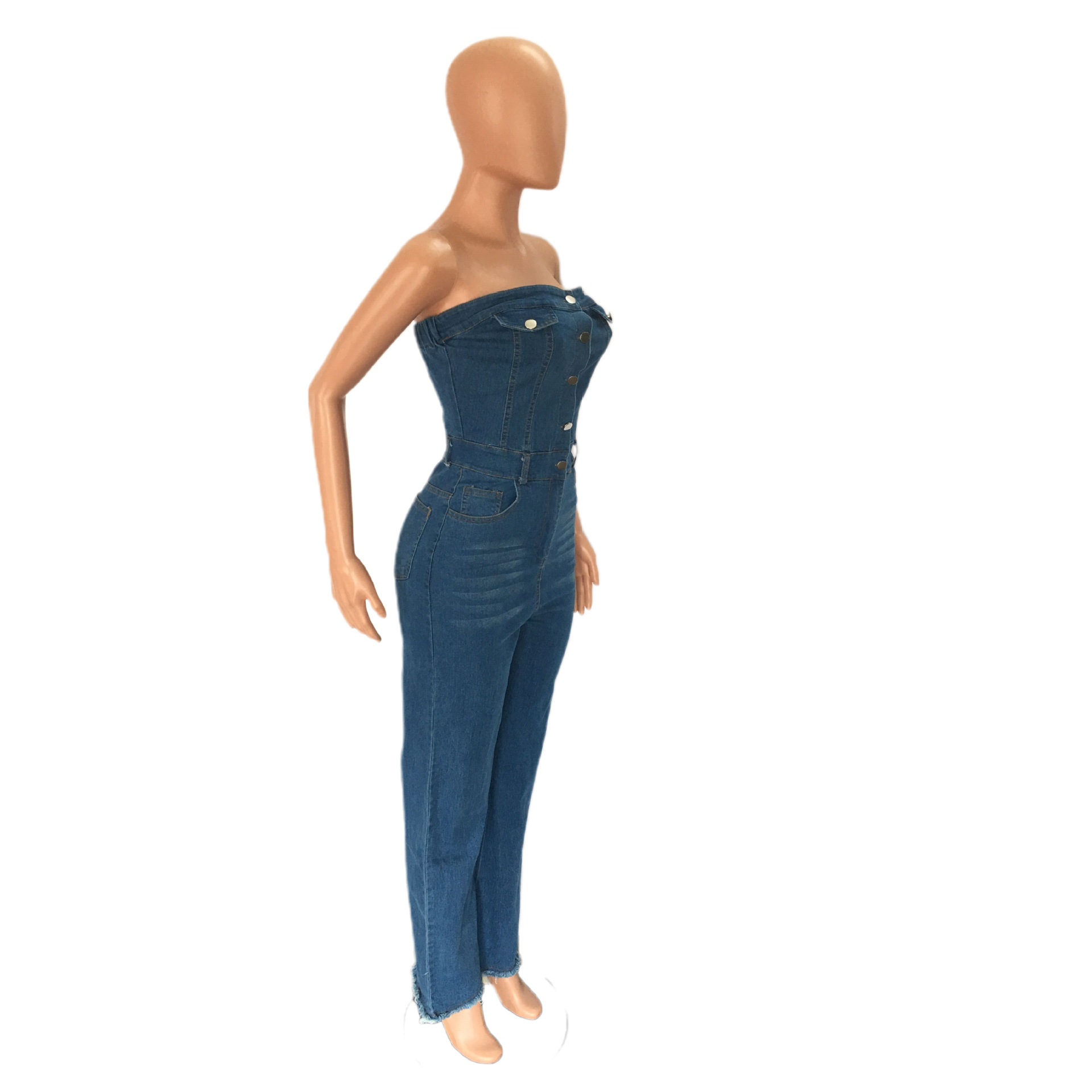 Women Clothing Tube Top Off Shoulder Slim Fit Slimming Slightly Flared Jumpsuit Jeans S Blue by Joliss | Fleurcouture